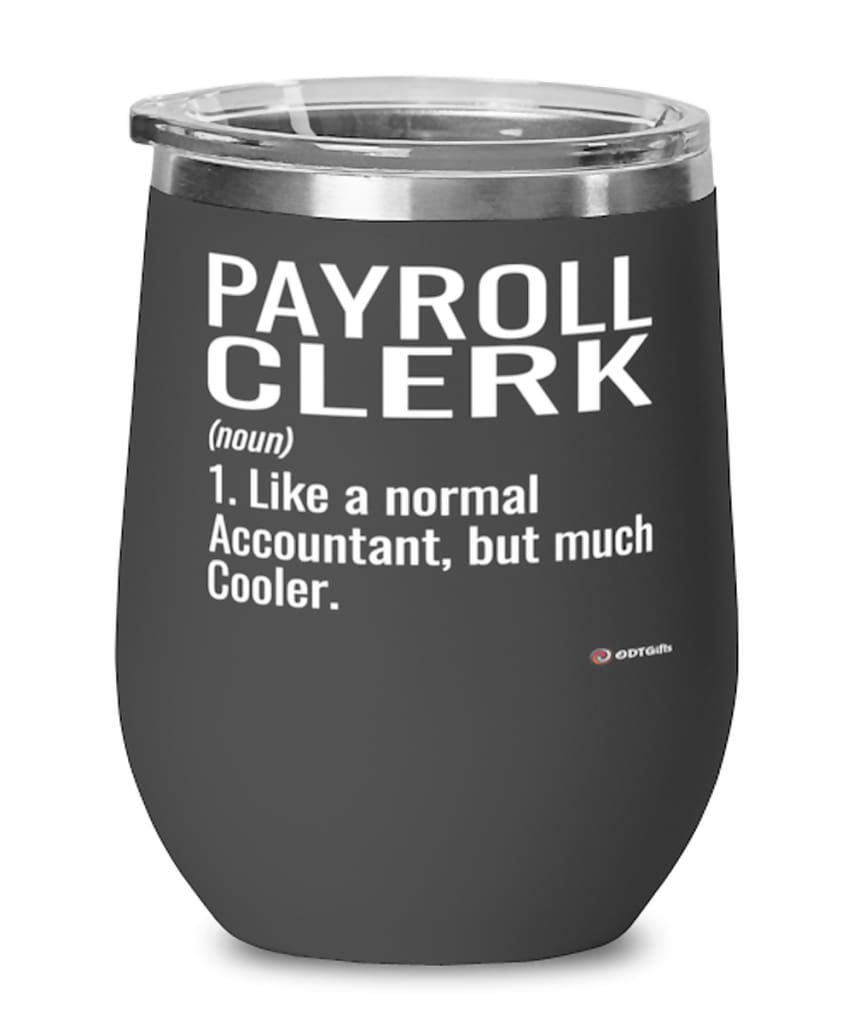 A beautiful stainless steel powder-coated stemless wine glass with a lid for Payroll Clerk. It's the perfect gift for wine drinkers! This wine tumbler has a double-wall vacuum insulated for hot and cold liquids, and we...