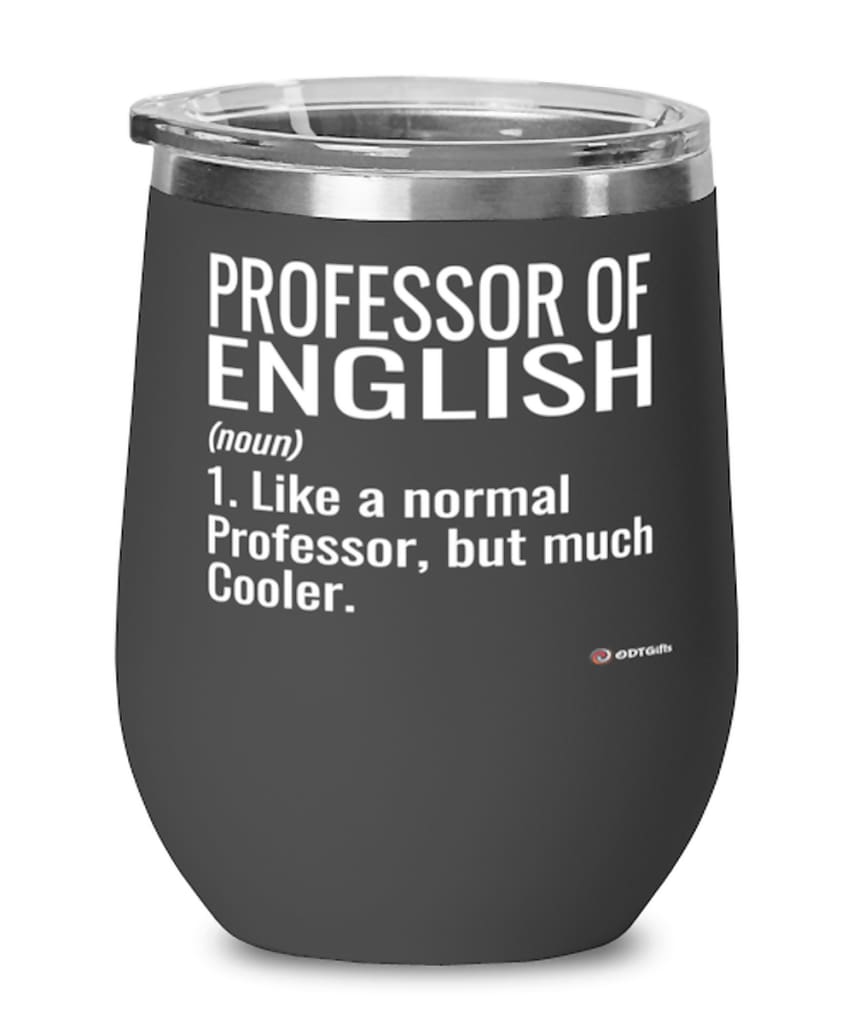 A beautiful stainless steel powder-coated stemless wine glass with a lid for English Professor. It's the perfect gift for wine drinkers! This wine tumbler has a double-wall vacuum insulated for hot and cold liquids, and we...