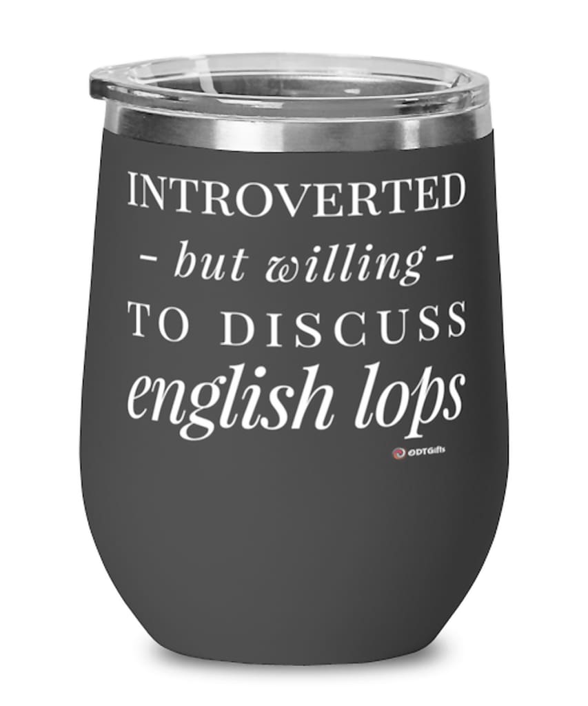A beautiful stainless steel powder-coated stemless wine glass with a lid for English Lops. It's the perfect gift for wine drinkers! This wine tumbler has a double-wall vacuum insulated for hot and cold liquids, and we...