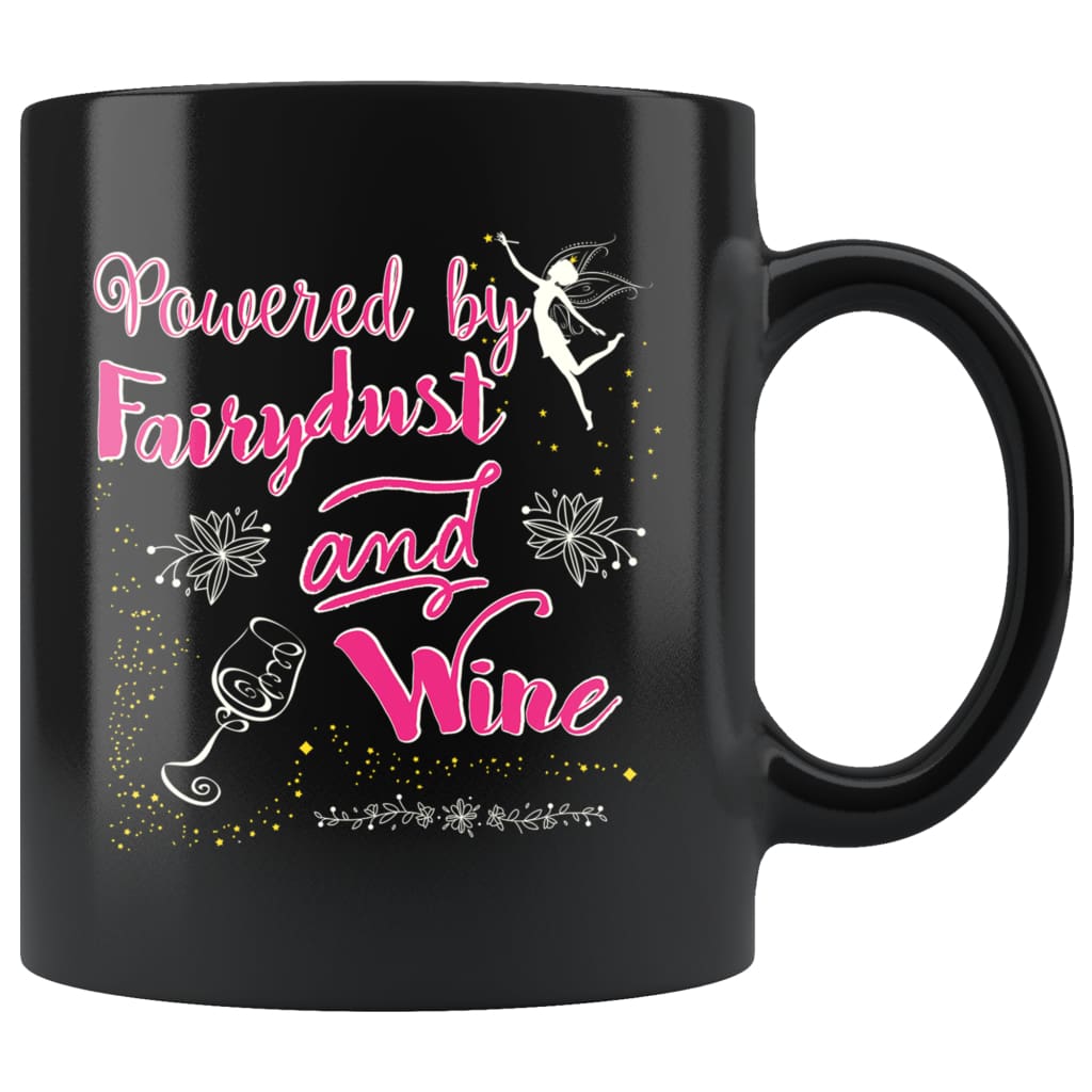 Funny Wine Mug text states Powered By Fairydust And Wine.This high quality 11oz. ceramic black mug has a premium hard coat providing a crisp and vibrant color reproduction that will last for years. With a high...