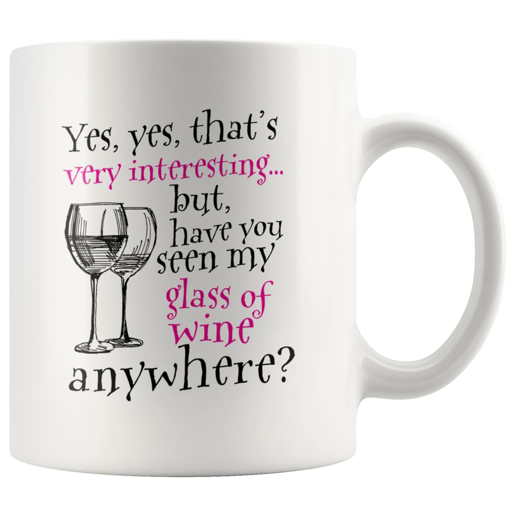Mug states Yes Yes That's Very Interesting But Have You Seen My Glass Of Wine Anywhere.This high quality 11oz. ceramic white mug has a premium hard coat providing a crisp and vibrant color reproduction that will...