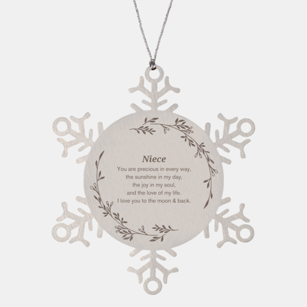 Drape this exquisite Niece Snowflake Ornament on your tree and watch as it shimmers and sparkles, creating a magical ambiance in your home. Made from high-quality stainless steel, it's not only a symbol of beauty but also durability. Even in the unfortunate event of a fall from the tree, it remains shatterproof, ensuring that your treasured ornament will last for generations.