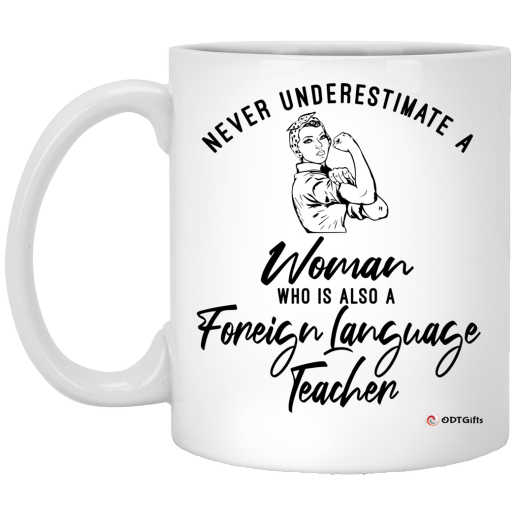 Foreign Language Teacher Mug Never Underestimate A Woman Who Is Also A Foreign Language Teacher Coffee Cup 11oz White High quality ceramic mug Dishwasher safe Microwave safe White gloss 11 oz Decorated with full wrap...