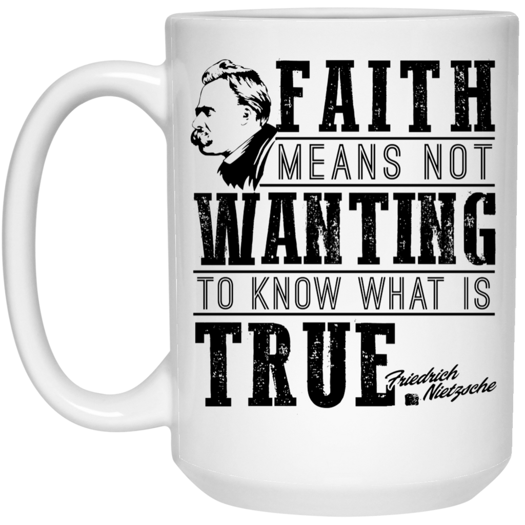 Friedrich Nietzsche Mug Faith Means Not Wanting to Know Coffee Cup 15oz White High quality 15oz white gloss ceramic mug Top to bottom full wrap decoration Microwave & Dishwasher safe ORCA Coating™ for maximum print vibrancy...