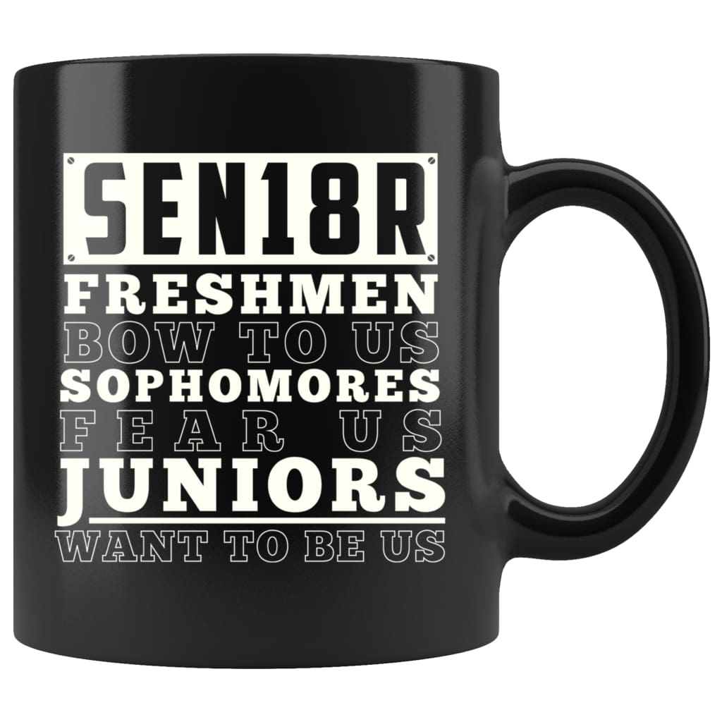 Mug text states Senior 2018 Freshman Bow To Us Sophomores Fear Us Juniors Want To Be Us.This high quality 11oz. ceramic black mug has a premium hard coat providing a crisp and vibrant color reproduction that will last for...